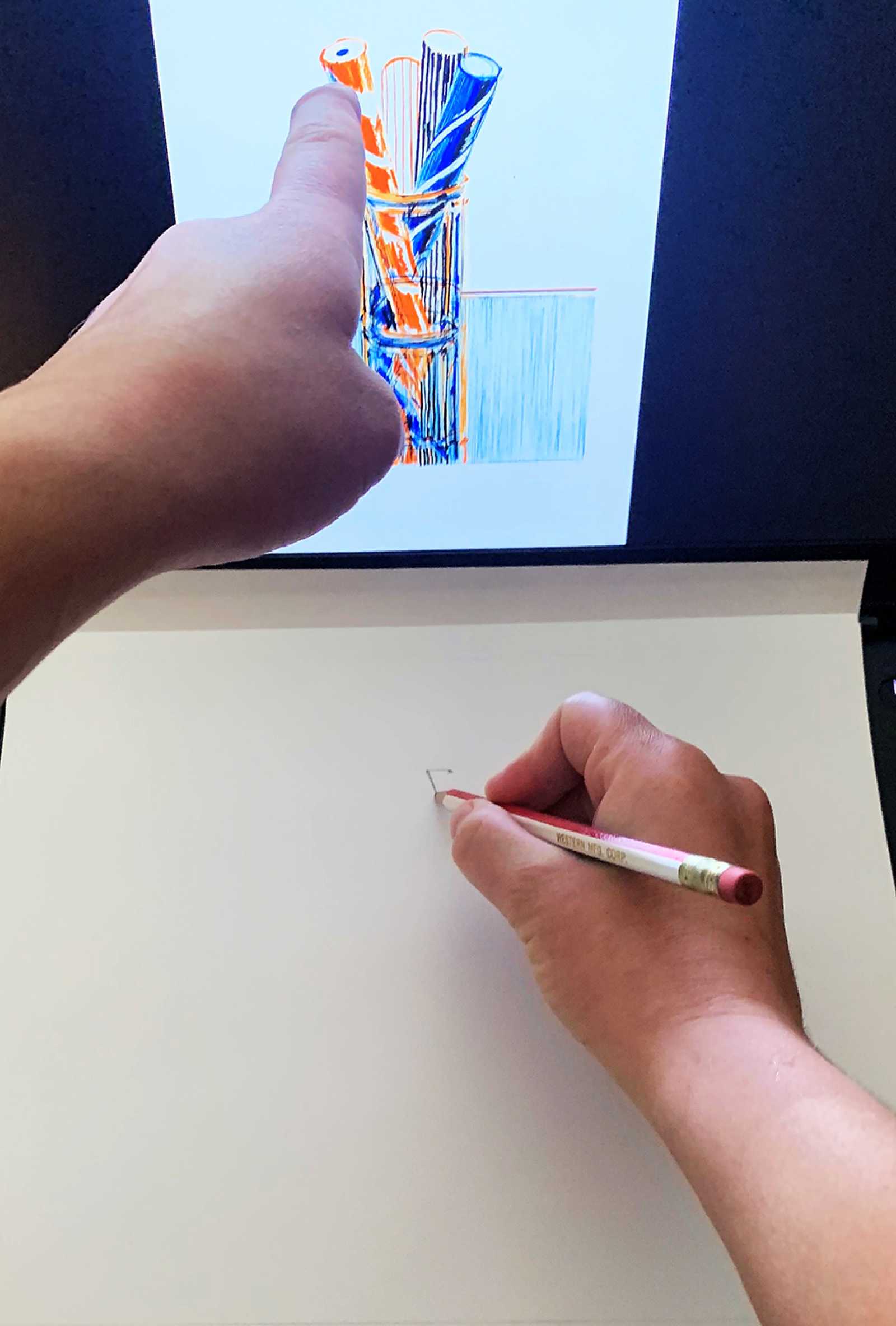 Select an area to begin your drawing. Place the tip of your pencil on your paper. Look back up at the object and slowly scan the edges and contours of the object as you begin moving your pencil along with your eye movements. Try not to look at the paper!
