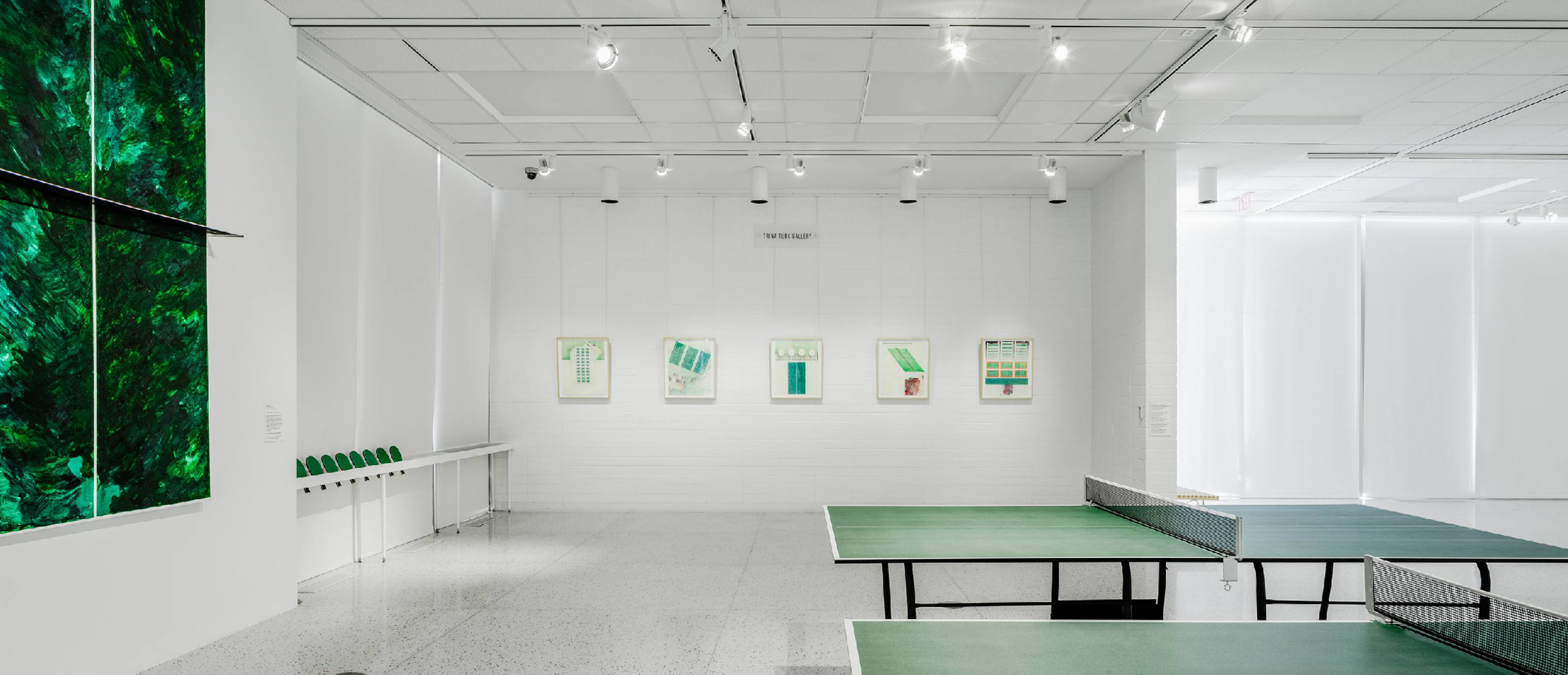 In 1990, SFMOMA mounted an exhibition of Solomon’s Ping Pong Table paintings. The paintings are the same size as actual ping pong tables. Her intent was to use the ping pong table's green rectangle to evoke the green rectangles of parks, gardens, public squares, and parking lots, a theme she explored in her 1998 book Green Architecture and the Agrarian Garden. Elements of the SFMOMA exhibition are recreated at the A+D Center: paintings paired ping pong tables that can be used by visitors.