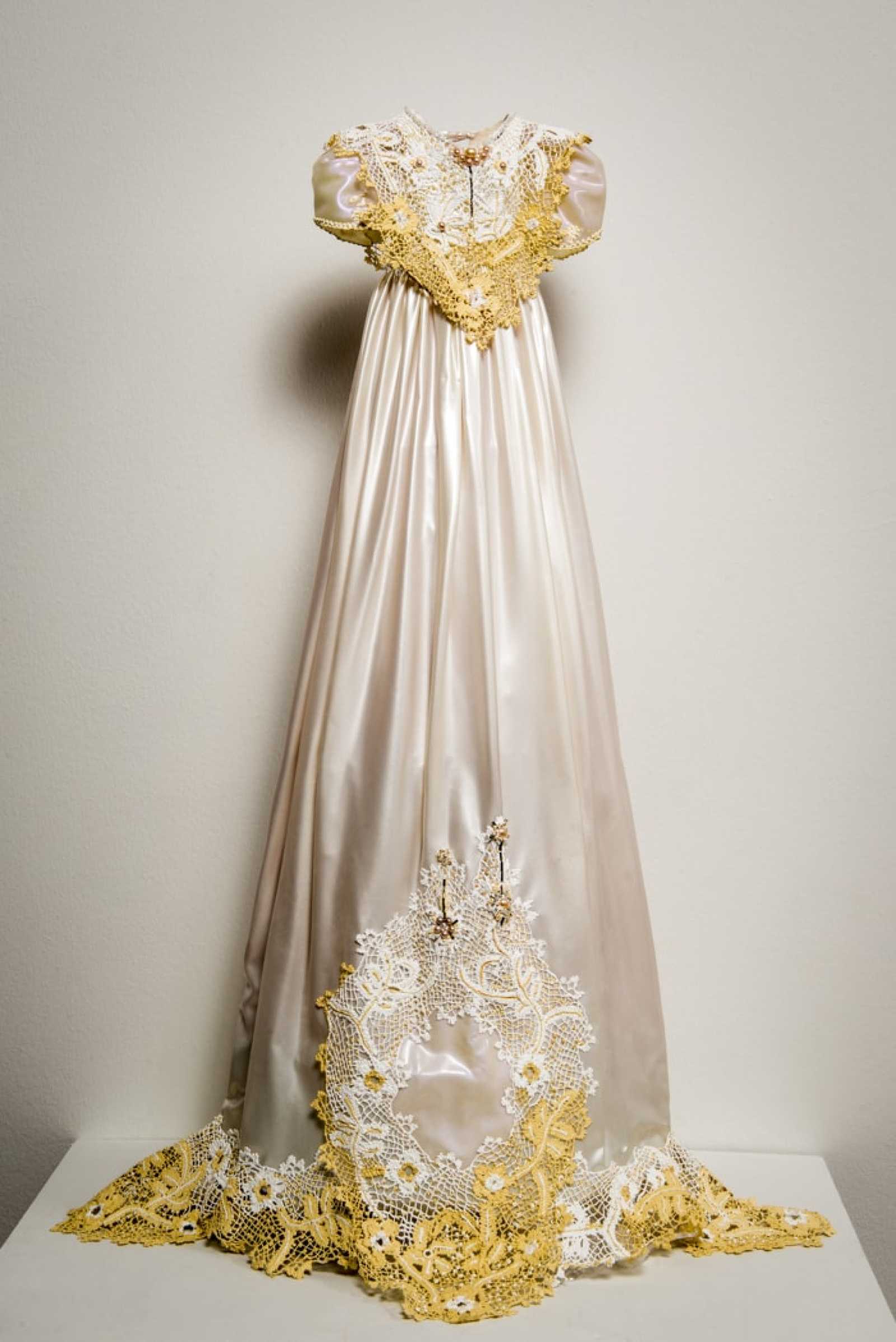 Pat Lasch, A Life Blessed: Christening Dress, H.V., Four Pregnancies, Two Births, 2014, acrylic paint, baroque pearls, photograph by David Plakke