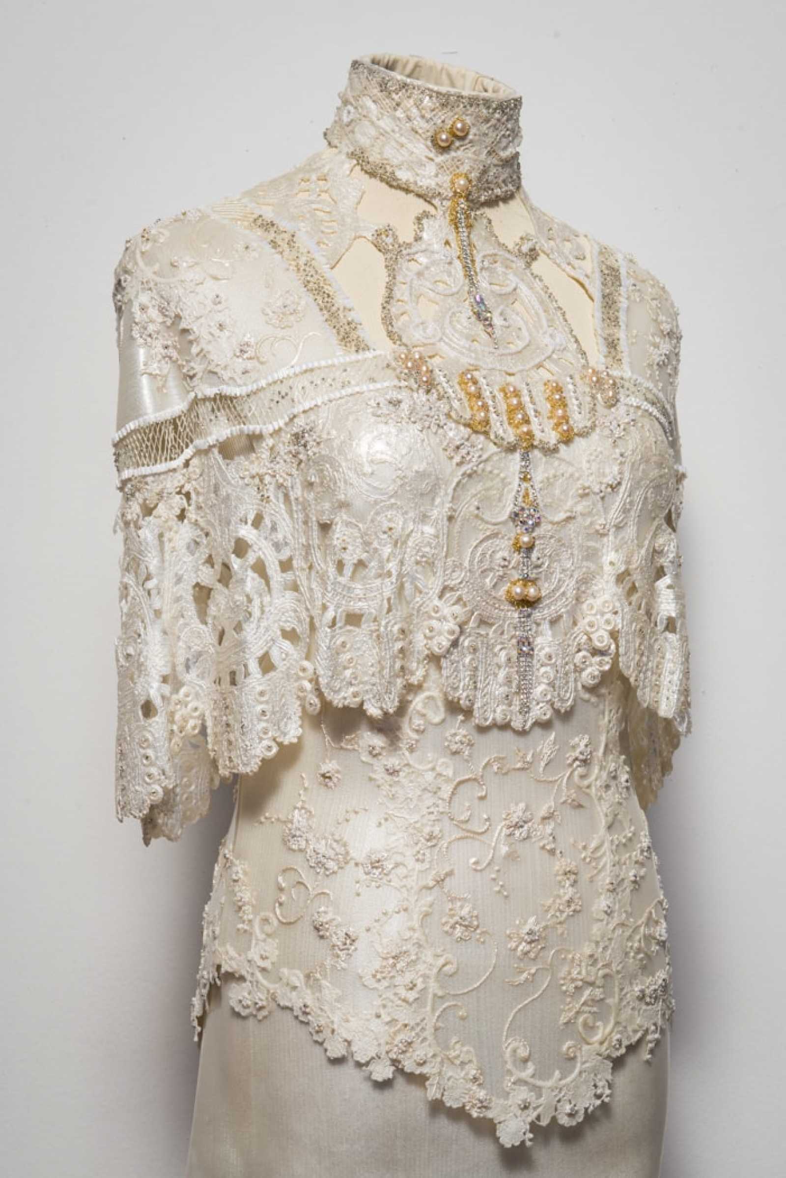 Pat Lasch, A Life Blessed: Wedding Dress, 2017, acrylic paint, baroque pearls, glass beads, crystals, photograph by David Plakke.