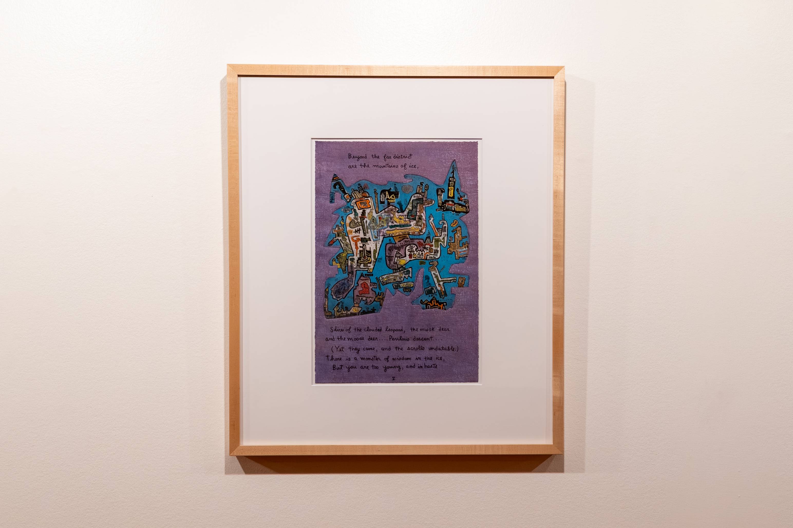 Johnston’s portfolio names the significant pilgrimage site of Kapilavastu, an ancient city where Siddhartha Gautama (Buddha) was raised. Though the artwork’s poetic text and elaborate images are detailed and descriptive, they can also be difficult to decipher, remaining in the realm of the fantastical. As viewers, we are placed along for the ride in Johnston’s visionary worlds. Johnston described her practice by saying, “I follow an urge to synthesize and combine into images, architectural, animal, human, plant and geographical structures… The drama is party colored by overtones of ancient and modern tales and myths.”