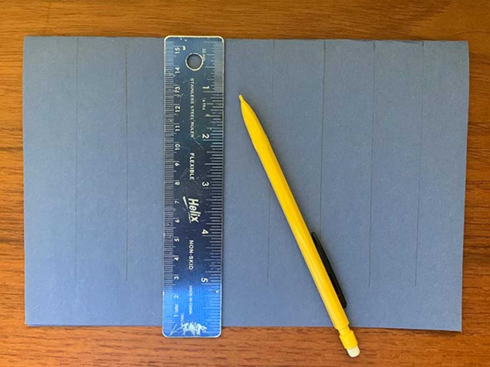 Start with the colored paper that will be used as your frame and fold it in half horizontally. From the top of the fold, measure and mark equally spaced lines. These vertical slats will create the warp of your weaving.