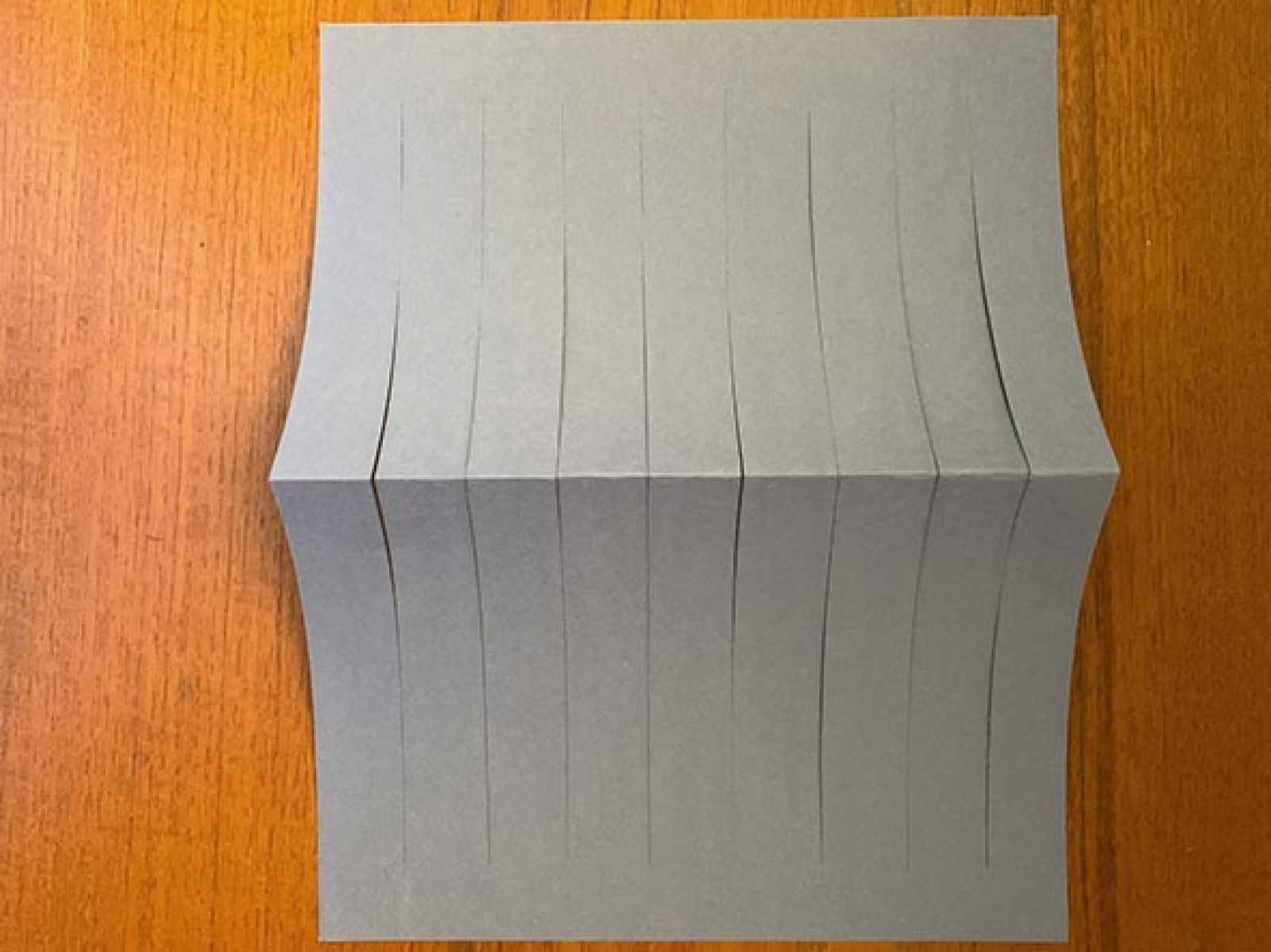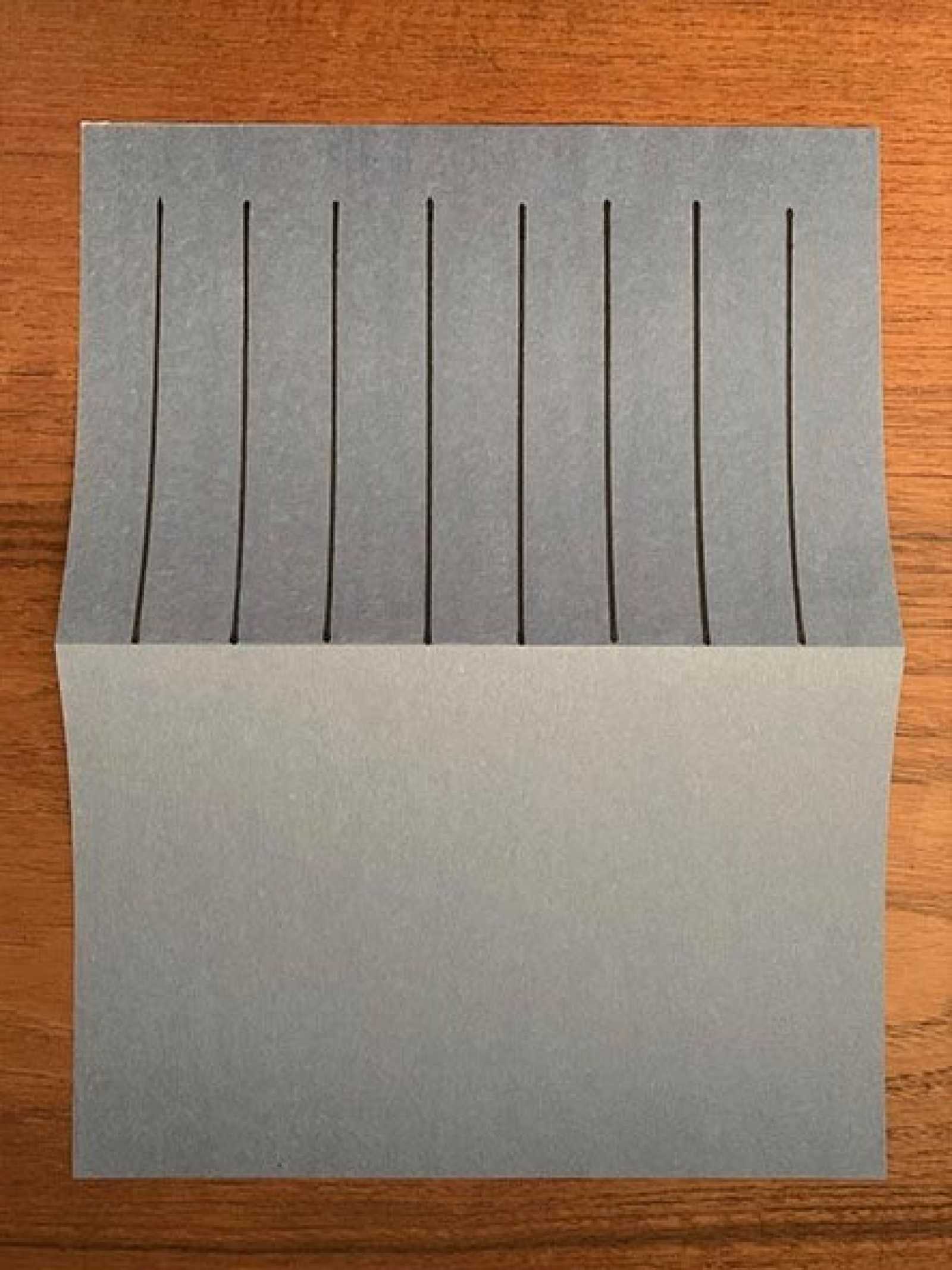 While your frame is still folded in half, cut along the markings in straight lines towards the bottom, stopping before you reach the edge of the paper. (Do not cut all the way to the end.) Unfold the paper and lay it flat, orienting the slats vertically (top to bottom).