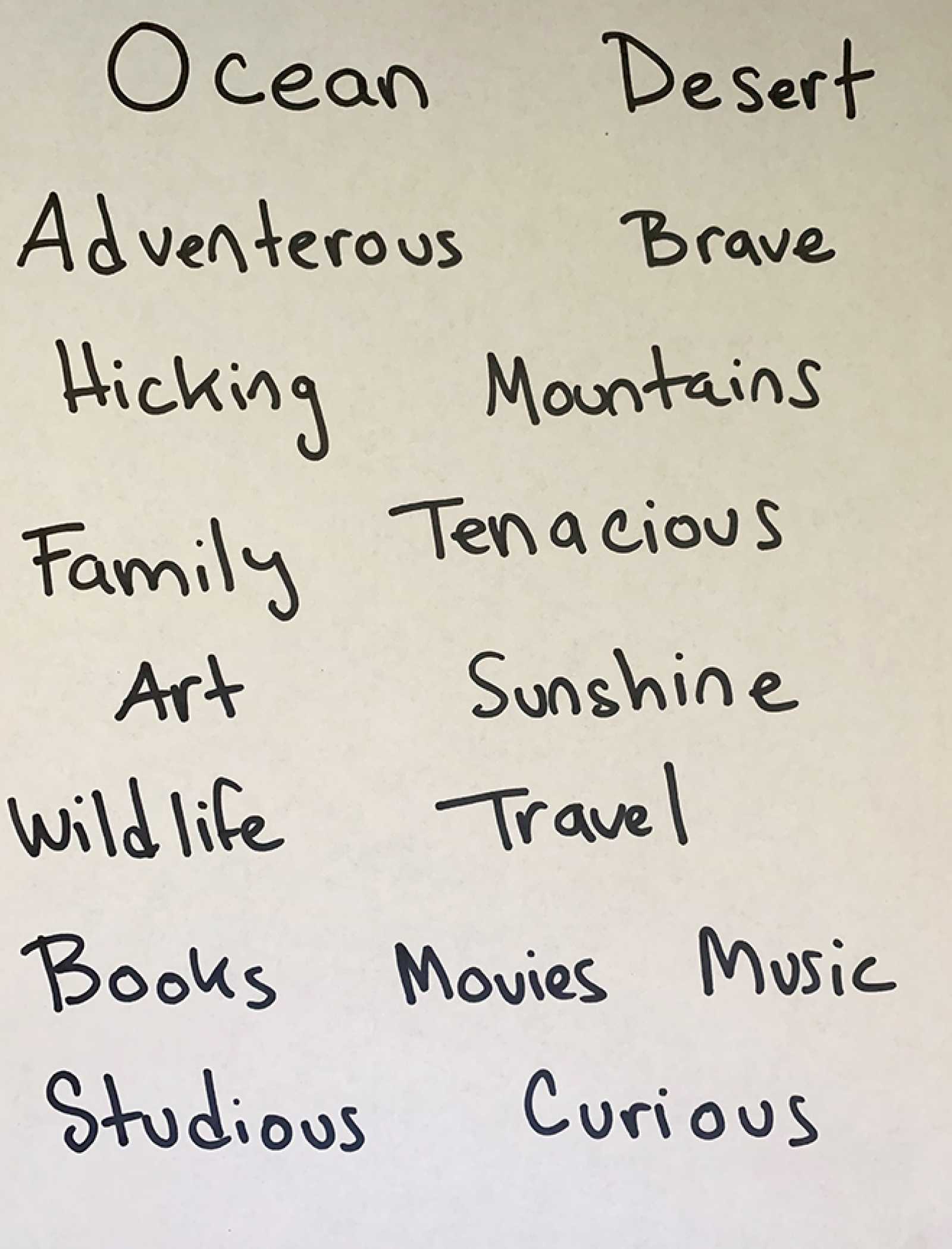 You might start by thinking about things you value, characteristics that define you, or activities that you like to do. Write a list of words or phrases that convey these ideas. Once you’ve completed your list, consider which ones to incorporate into your symbol.