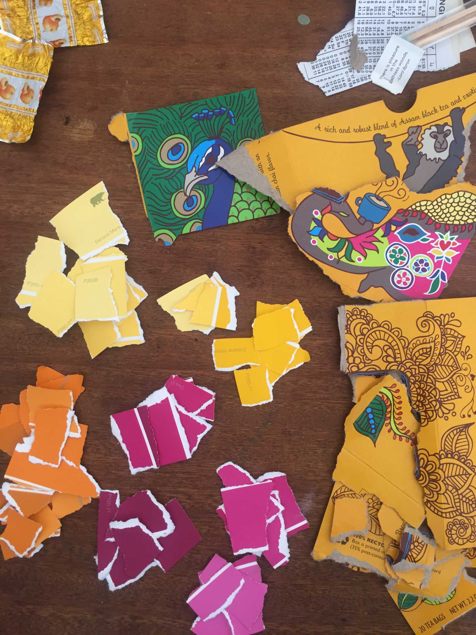 Tear or cut the collage materials into small pieces, and sort them by color or pattern or size to create your palette. Look for large swatches of color and patterns in advertisements and interesting textures in photographs. (Tip: The more pieces you have to work with, the better. Leftover pieces can be stored in envelopes or bags for later use on additional art works!)