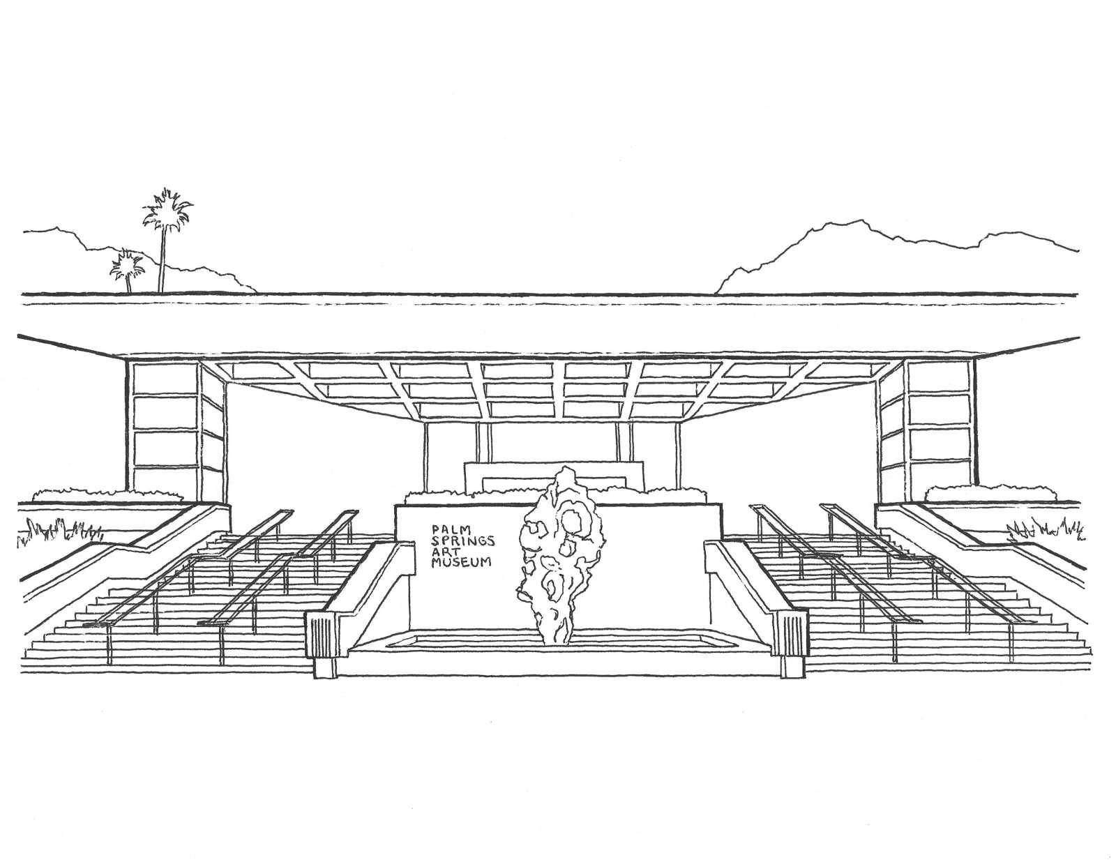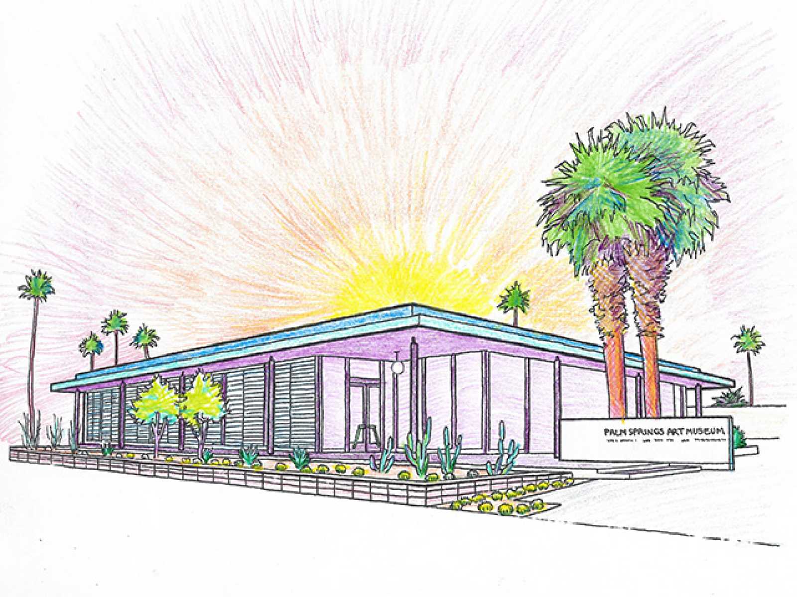 These drawings of the Palm Springs Art Museum and the Architecture and Design Center, Edwards Harris Pavilion were created by Danny Heller, a Coachella Valley artist who creates art that focuses on midcentury American imagery, specifically the architecture, design, and car culture. His own work has been inspired by the architecture of E. Stewart Williams.