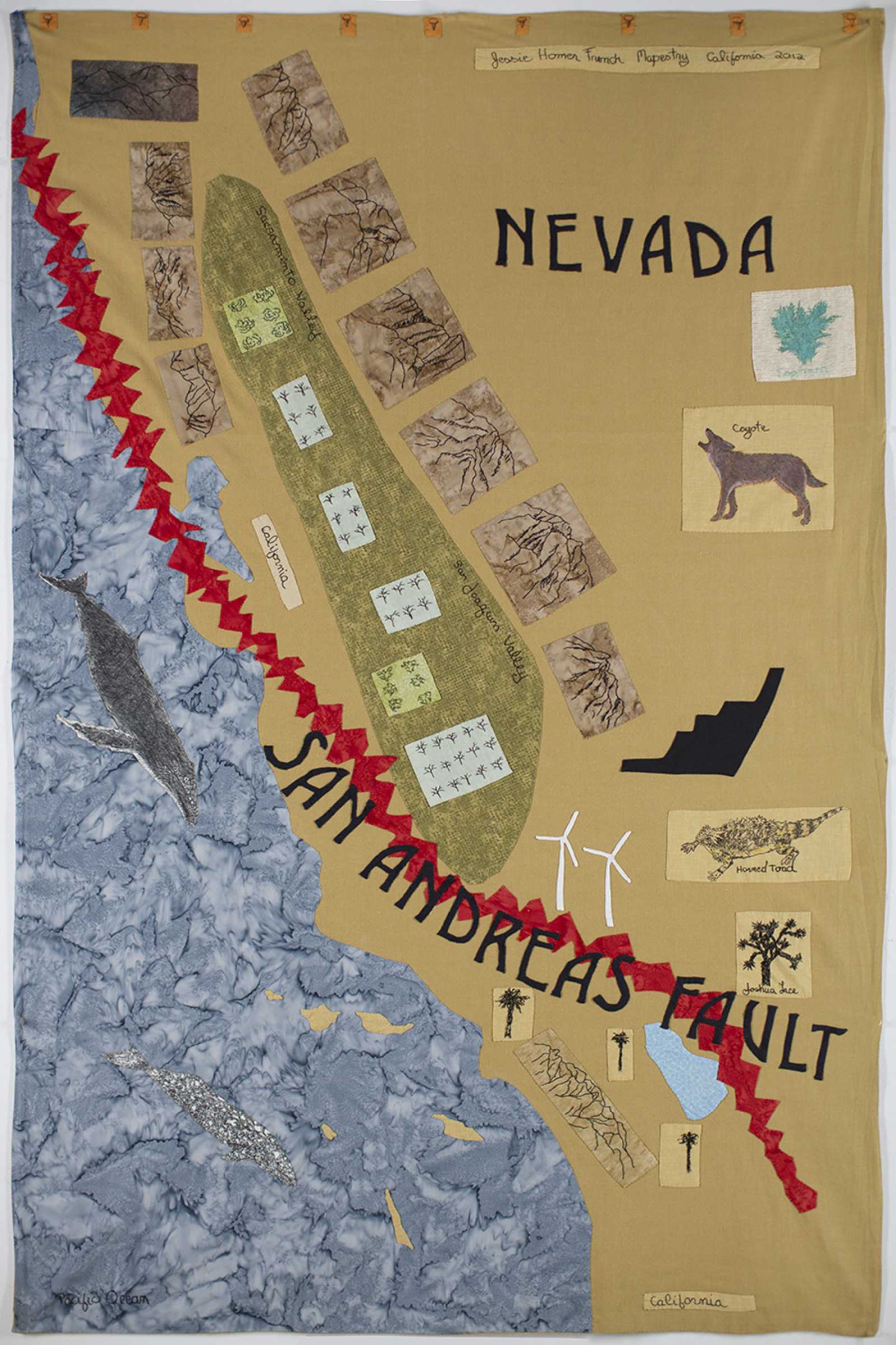 Jessie Homer French (American, born 1940), Mapestry California, 2012, fabric, thread, fabric paint, and pen, 66 × 42 inches. Museum purchase with funds provided by Robert Shiell, 2017.31
