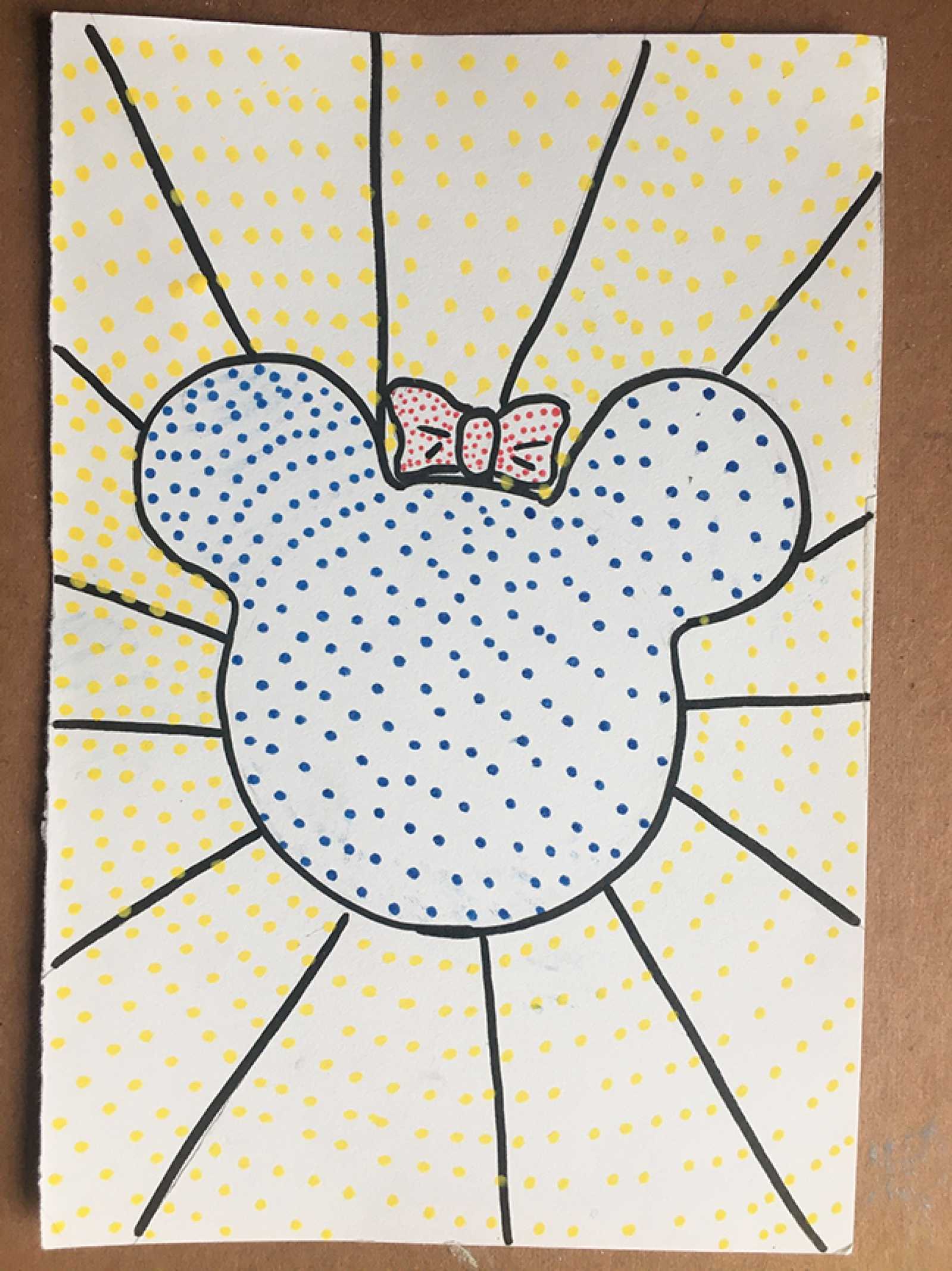 The dotted effect in Lichtenstein’s paintings is inspired by the Ben-Day printing process, an inexpensive printing method that was used for comics and other color printing that began in the 19th century and continued on into the middle of the 20th century. This process uses small dots of the same size, arranged in straight lines, to create color and shading. The closer the dots, the darker the color; the further the dots, the lighter the color.
