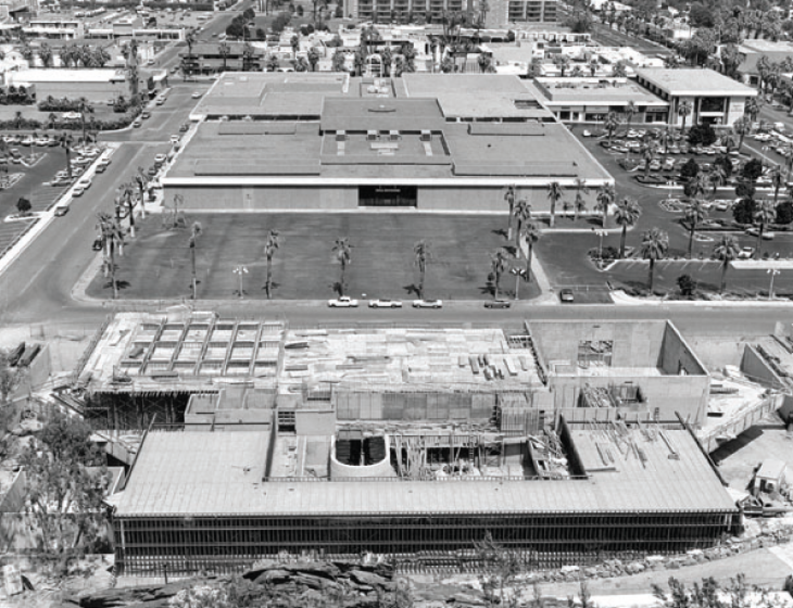The museum was originally founded as the Palm Springs Desert Museum and located at 135 E. Tahquitz-McCallum Way in its small downtown building erected in 1958, built by the two local architecture firms, Williams, Williams, and Williams and Clark, Frey and Chambers. By the early 1970s, Palm Springs had grown sufficiently in size and stature to support a much larger cultural institution, and the board undertook a new endeavor, planning for the current building, designed by E. Stewart Williams, and considered to be his most significant civic monument. The Palm Springs Desert Museum opened in 1976 and later became the Palm Springs Art Museum in 2005.