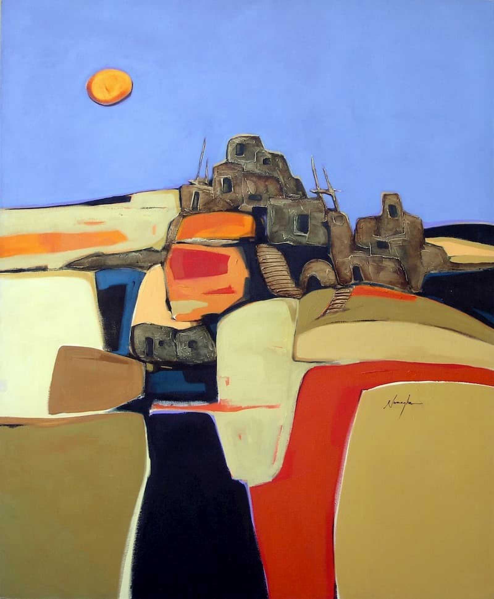 In the mid-1970s, Namingha began to explore the architectural structure and sensibility of the ancestral villages of the ancient Hopi and Pueblo cultures. In Coming of Winter, the forms of the pueblo emerge and blend with the more organic forms of the landscape. In the Hopi belief system, civilization emerged from the earth, and the desert landscape provides a source of spiritual strength. Thus in this work, the multilayered rock forms are the artist’s depiction of the way the earth was formed, with the clusters of Pueblo dwellings appearing as though rising out of the earth toward the azure sky. There is a continuity between the geological formations underground and the natural and man-made structures above.