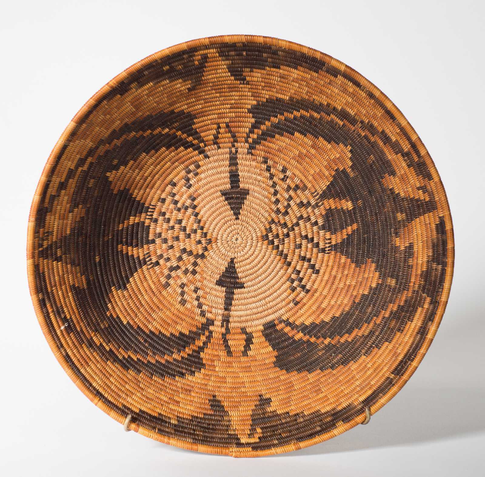 Cahuilla basket makers were known for their intricate, bold designs and attention to detail. The exquisite, complex design of Rain and Sun Eagle Basket by Lupe Alberras balances positive and negative forms, which appear as dark and light, to create a sense of dynamic movement and tension. It is as if these majestic birds are caught in flight, as in the case of the sun eagles, or are about to take flight, as in the case of the darker rain eagles. The eagles surround a pair of black arrows on a white sumac background that meet in the center representing strength; these radiating lines are perhaps meant to resemble lightening and rain during a storm. The variegated background is made of tan and orange juncus—reminiscent of the colors of the desert landscape.