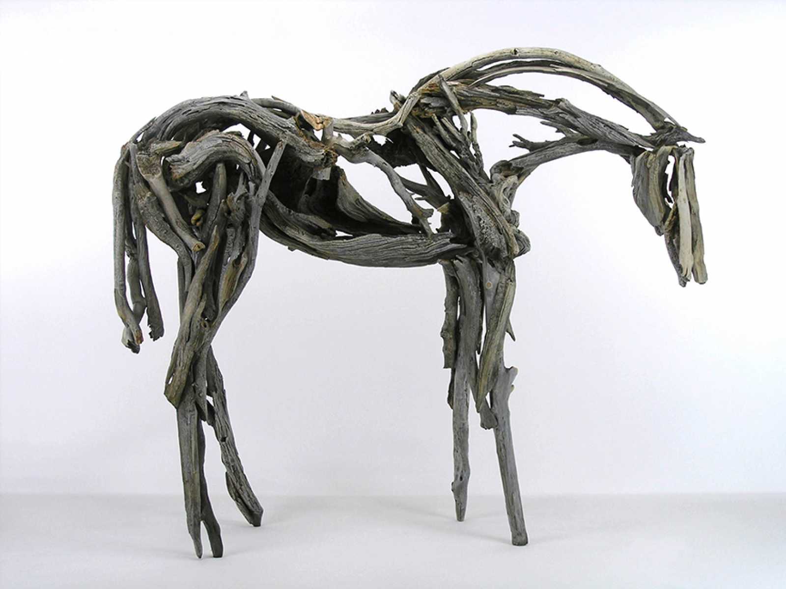 Butterfield explains that her horse imagery provides her a way of creating a metaphorical self-portrait. She has created horses in a myriad of poses, postures, and attitudes from standing upright, as in this work, to grazing or lying down—each with its own individual personality. The spaces between the branches give her horse its rhythm and relative density, while inviting the viewer to discover hidden secrets such as the root that is wrapped around a rock. According to Butterfield, in this work, “The striated pattern of parallel lines reminded me of raked Zen gardens, so I titled this gentle horse Ryuanji.”