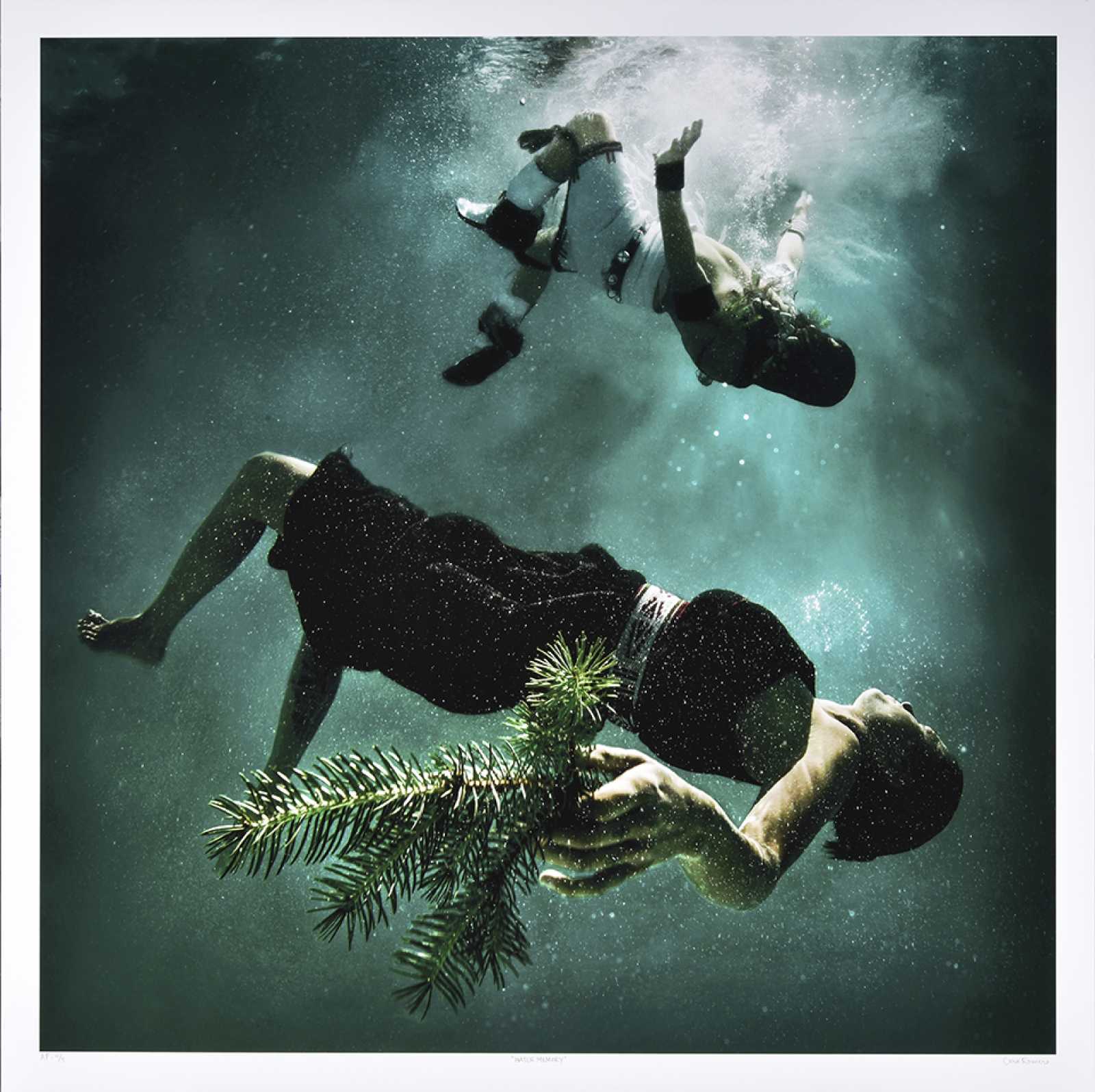 Cara Romero maintains a strong connection to her Native Chemehuevi land and culture of the vast California Mojave Desert. Water Memory is from a series of works that focus on the loss of water on Indian reservations throughout the West, calling attention to the destructive effects of climate change and the impact of government projects on Native lands, such as the building of dams and other water restrictions. In this work, Romero photographed her models underwater as they fell into a pool dressed in traditional Pueblo Corn Dance attire—a ceremonial dance expressing supplication or thanksgiving for the maize crop. The subjects, Rose B. Simpson (Santa Clara Pueblo) and Santiago Romero (Taos/Cochiti Pueblo), come from communities recently ravaged by flooding in the aftermath of wildfires in New Mexico.