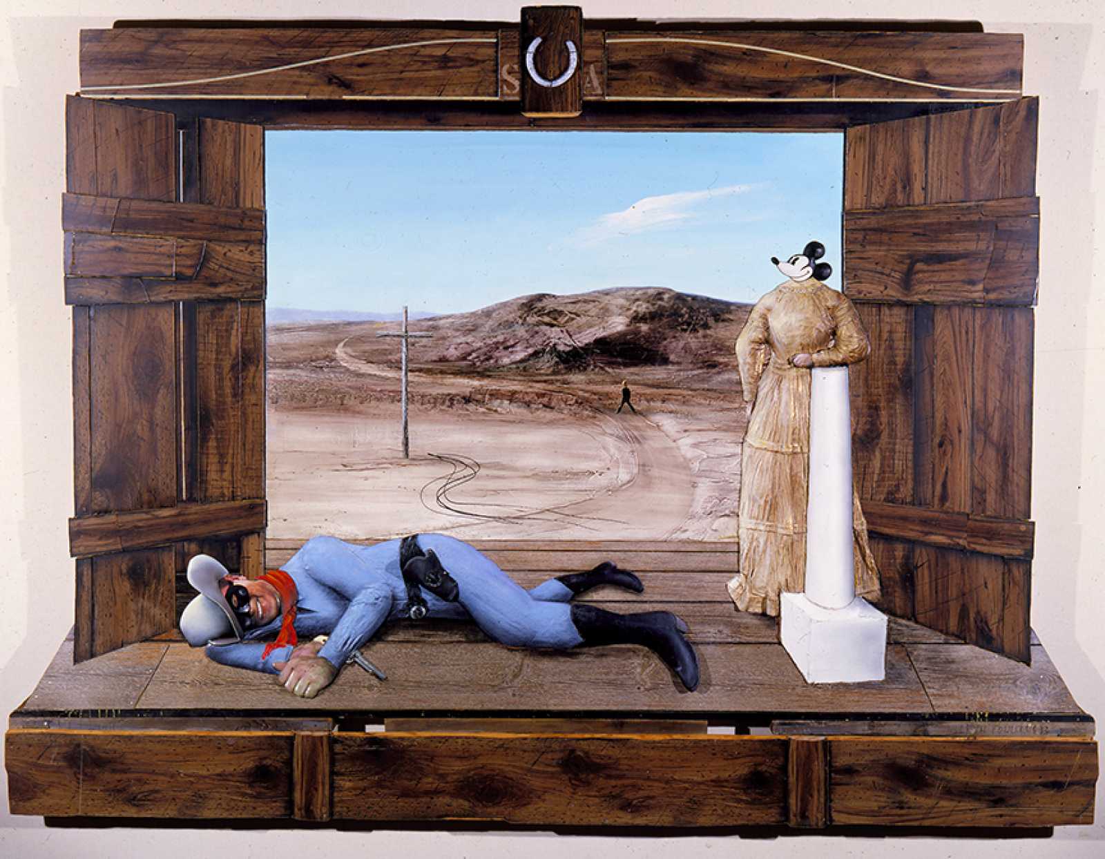 His career over the past 50 years has included emotionally charged paintings filled with social commentary that target corporate America, often by using cartoons and comic figures, especially Disney characters. His works typically combine delicately painted surfaces with found materials and thick mounds of mixed media, including wood. Fusing narratives and landscape-based settings, his works present characters in what often appear to be stage sets. In The Last Outpost, he presents a child holding a toy gun acting out a fantasy of destroying a popular representation of the male adult as a cowboy, watched over by a woman with Mickey Mouse’s head. Anger, nostalgia for the past, apprehension for the future, and changing values are suggested in this complex work.