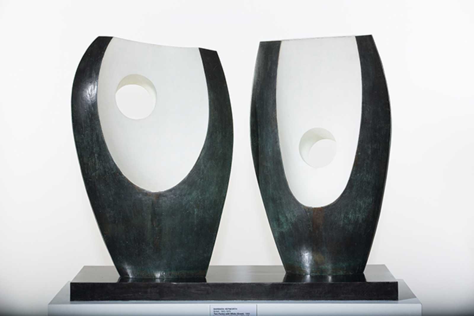 Barbara Hepworth (British, 1903-1975), Two Forms with White (Greek), 1969, bronze with white paint, edition 4/7, 39 ¼ x 49 x 21 inches. Gift of Caryl Golden and Robert Zinner from the Estate of Kathryn B. Pollak, 39-1995.