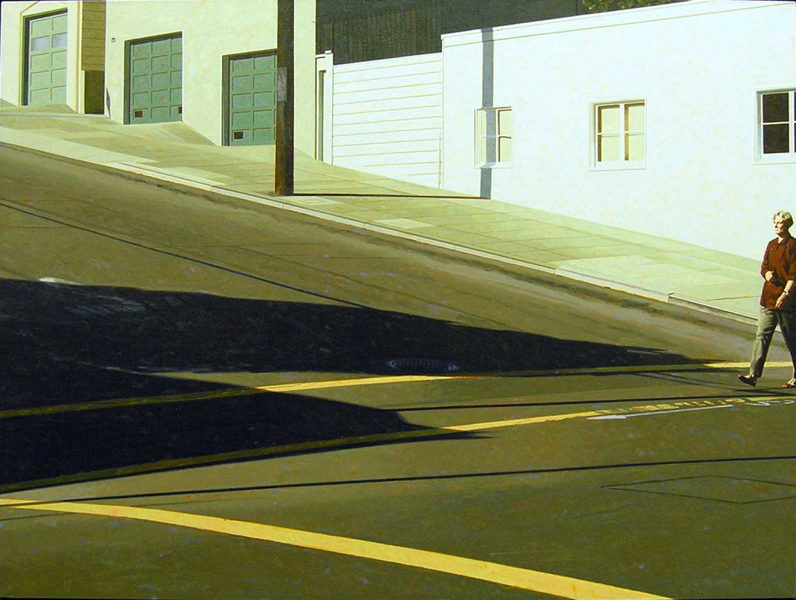 Bechtle focused on things he knew best—the neighborhoods, cars, families, and ordinary scenes of middle-class American life. In Crossing Arkansas Street, he situates the viewer on the edge of the pavement at an intersection of two wide, nearly empty streets on Potrero Hill in San Francisco. Yellow crosswalk lines direct the viewer’s focus across the painting as the lone figure—the artist’s wife, Whitney Chadwick—enters the frame.