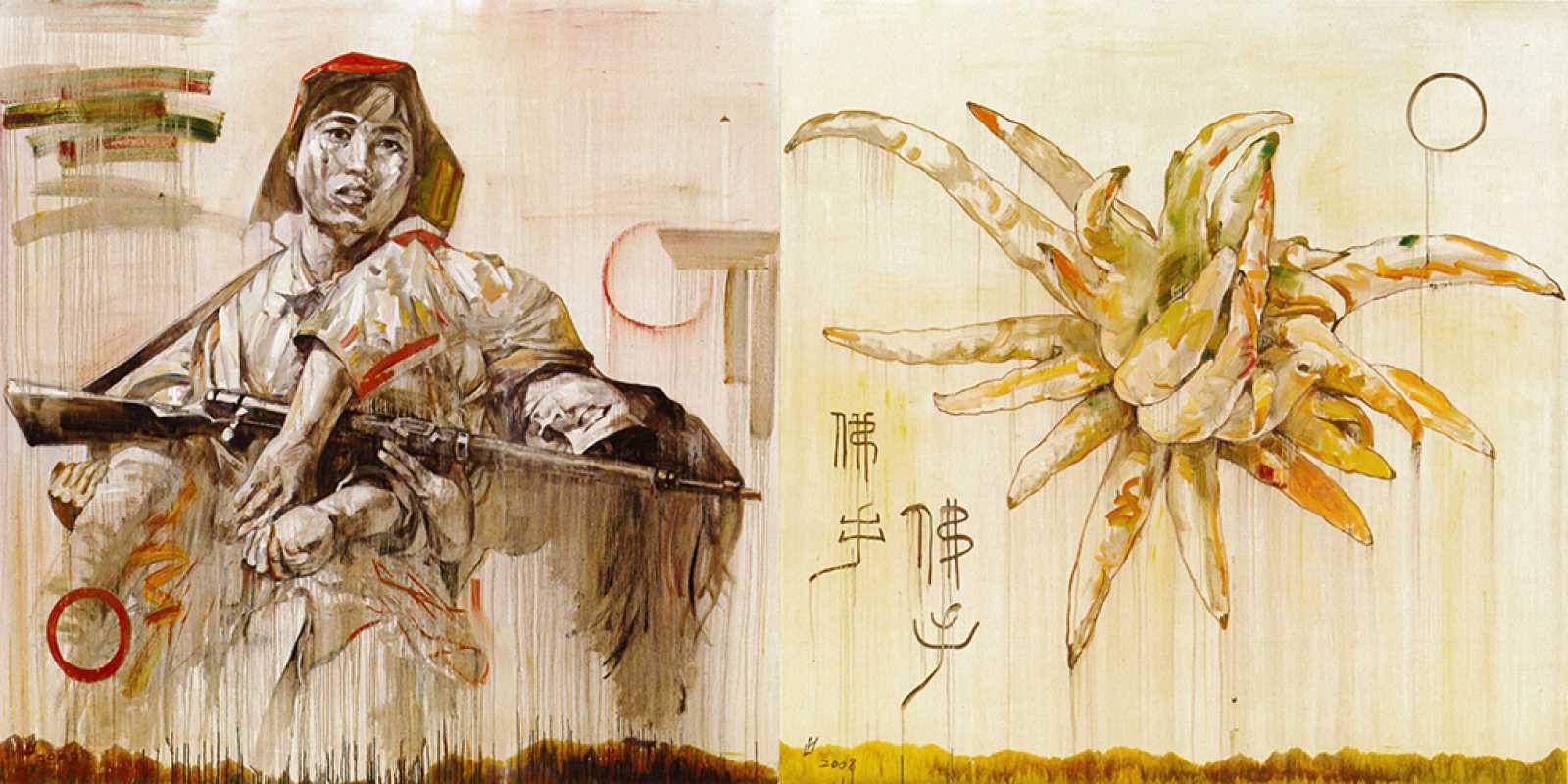 This painting features many signature elements of Hung Liu’s style: painterly brushwork, dripping paint, multiple canvases, and attention to the figure within direct or implied narratives. This diptych is part of the artist’s “Daughters of China” series that depicts the events in which eight female soldiers fought the Japanese and died in 1938. On the left is a rendering of a still from a propaganda film about these soldiers that Liu remembers seeing as a child. On the right, she depicts the Asian citrus fruit known as “Buddha’s hand,” which is offered during the Chinese New Year to represent happiness, longevity, and good fortune.