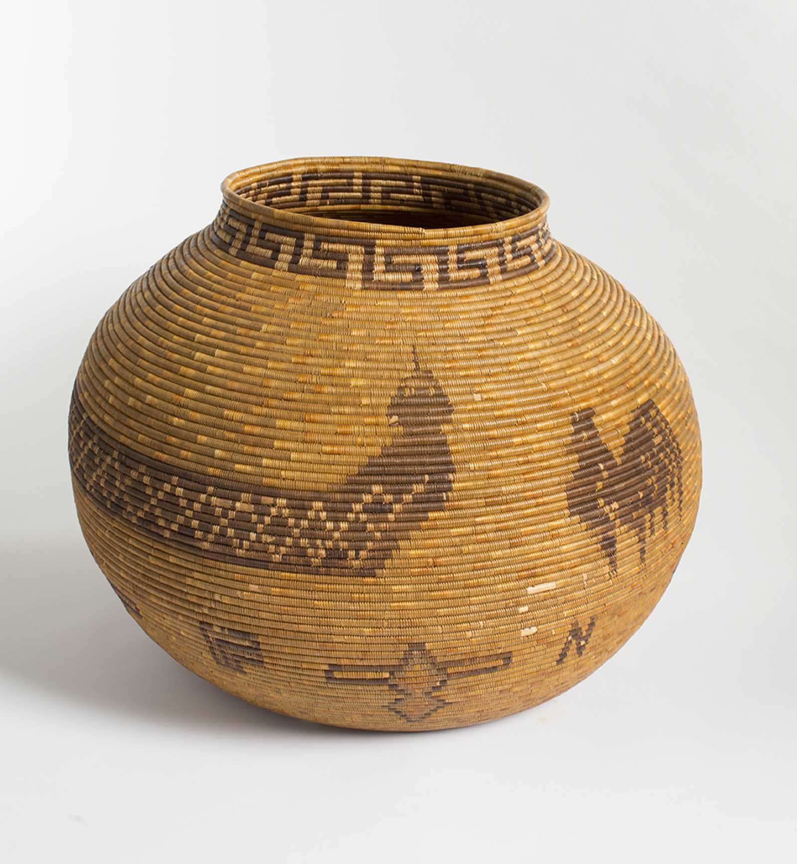 Dolores Saneva Patencio (Cupeño (Kuupangaxwichem), Cupa (Kupa) Reservation and Cahuilla, Agua Caliente Band, c. 1860 - 1931), Large Olla Storage Basket, c. 1910, sumac, natural and dyed juncus on a deer grass bundle foundation, 18 × 22 inches. Museum acquisition by exchange: Gift of Winifred Little, Edwin D. Walker and Mr. and Mrs. James H. Kelley, A1-1988. © Palm Springs Art Museum, photograph by Taylor & Associates, Inc..
