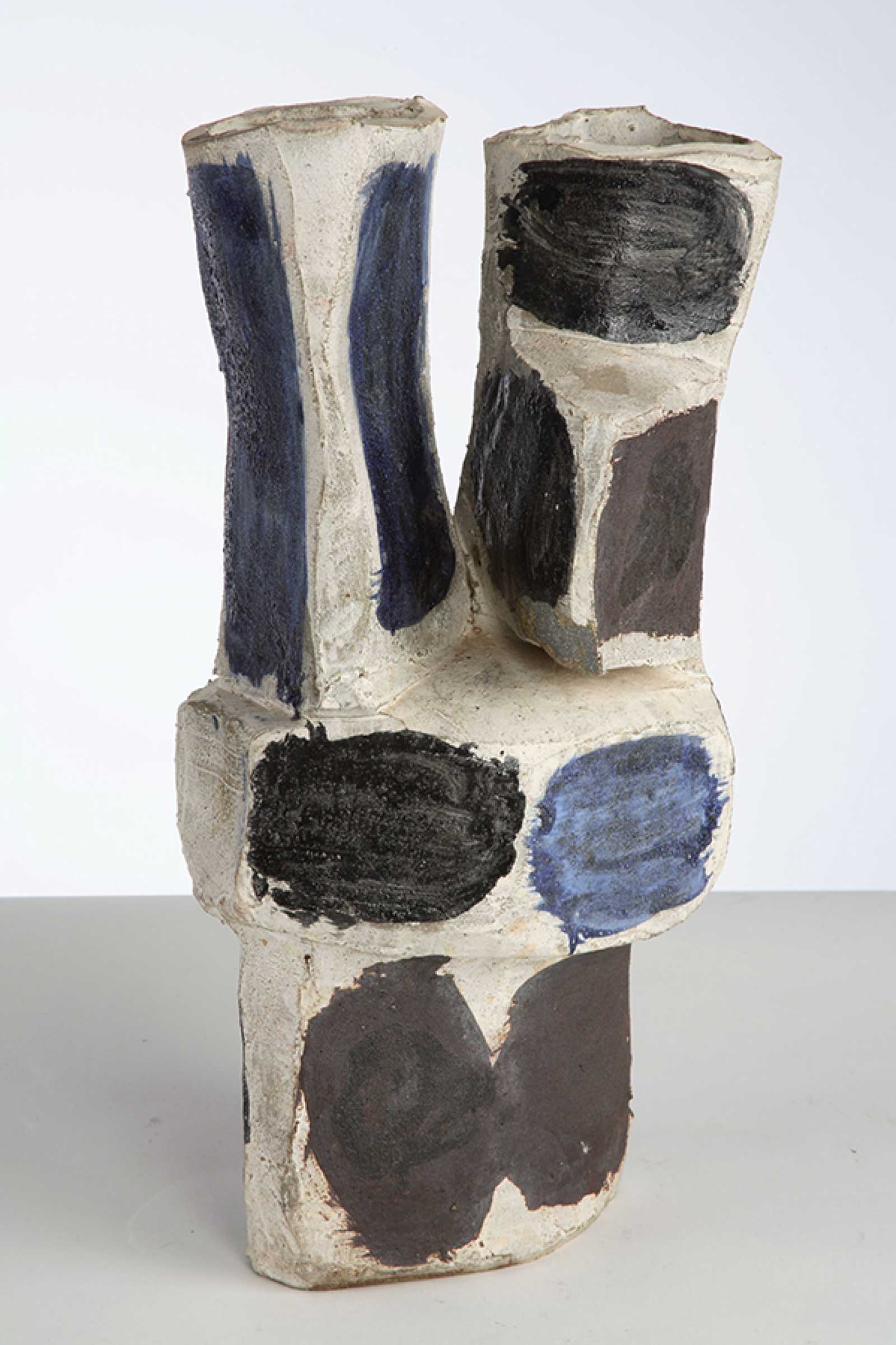 During the 1950s and 1960s, Peter Voulkos was a primary force behind the California clay art movement, which challenged hierarchical attitudes toward ceramics as a craft. He made bold, energetically constructed ceramic sculptures, effectively transposing into three dimensions Abstract Expressionist dynamics found in painting. Voulkos became familiar with Abstract Expressionist painters during a summer of teaching at the experimental Black Mountain College in 1953 where interdisciplinary experimentation between media was encouraged. Pottery #1 is a roughly formed vase-like structure, with vertical double necks emerging from a wider body, and black and blue spots of color standing out against a white ground.
