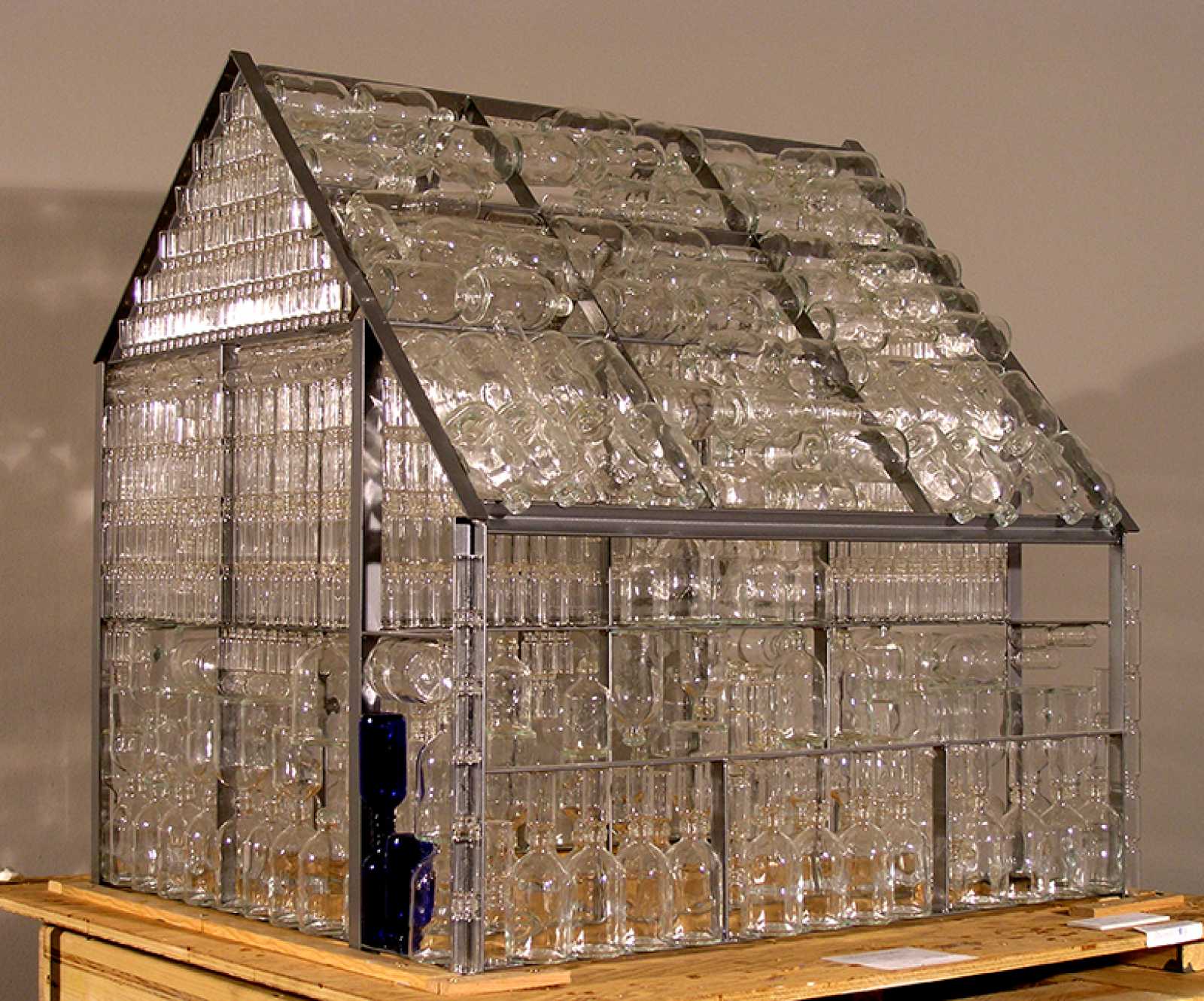 Howard’s first glass house created in 1990 was inspired by the bottle houses described by African-American writer James Weldon Johnson (1871–1938) in his Autobiography of an Ex-Colored Man. The novel, published in 1912, describes a boy who grew up in a home surrounded by bottles, placed neck down into the dirt, which he believed grew like flowers. In various African cultures, bottles placed in front of homes represent protection and safekeeping. Howard’s bottle houses also suggest places of reflection and safekeeping, as well as opportunities for discovering and reflecting upon one’s own history.