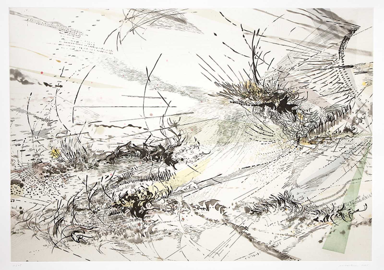 From a series of prints that convey weather patterns, wind currents, convection movements, light rays, and other natural formations, Julie Mehretu’s Diffraction was produced at Crown Point Press in San Francisco. The title, Diffraction, conveys the process by which light or waves spread, resulting in additional waves of interference or dissonance. Mehretu’s work often features intersecting lines and networks inspired by mark-making as disparate as cartography, architectural renderings, graffiti, and calligraphy. Conceptually, her work is underpinned by rigorous examinations of topics including history, colonialism, capitalism, migration, climate change, diaspora, displacement, and technology.