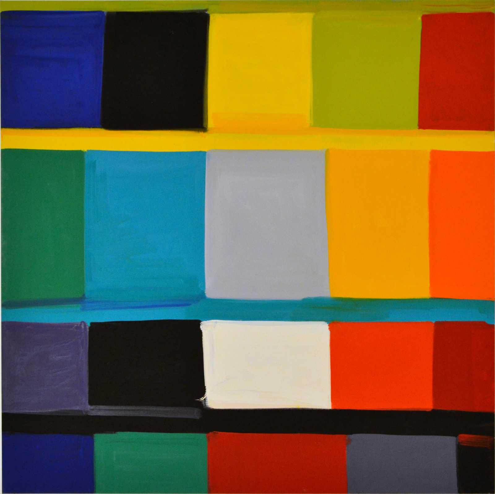 In this painting, Whitney divides his canvas into a grid, filling each square with vibrant hues that complement and offset the surrounding colors. As a colorist working in an abstract language, Whitney uses the same structure repeatedly, dividing his canvas into four bands of boldly imperfect blocks separated by three deliberate horizontal stripes. These loosely latticed compositions juxtapose individual hues, textures, and tonal values, with pure colors that can vibrate—akin to the visual effects in abstract color field paintings by Mark Rothko, or the artistic traditions of patchwork quilting.