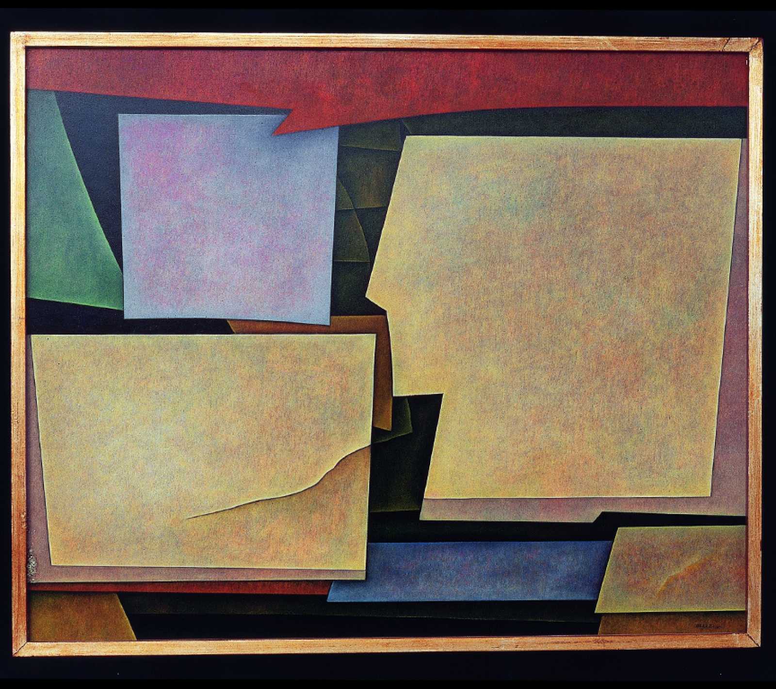 Gunther Gerzso (Mexican, 1915-2000), Tres Formas: Ancient Forms, 1964, oil on Masonite,23 ½ x 28 ¾ inches. Gift of Mr. and Mrs. Jennings Lang, 22-1972