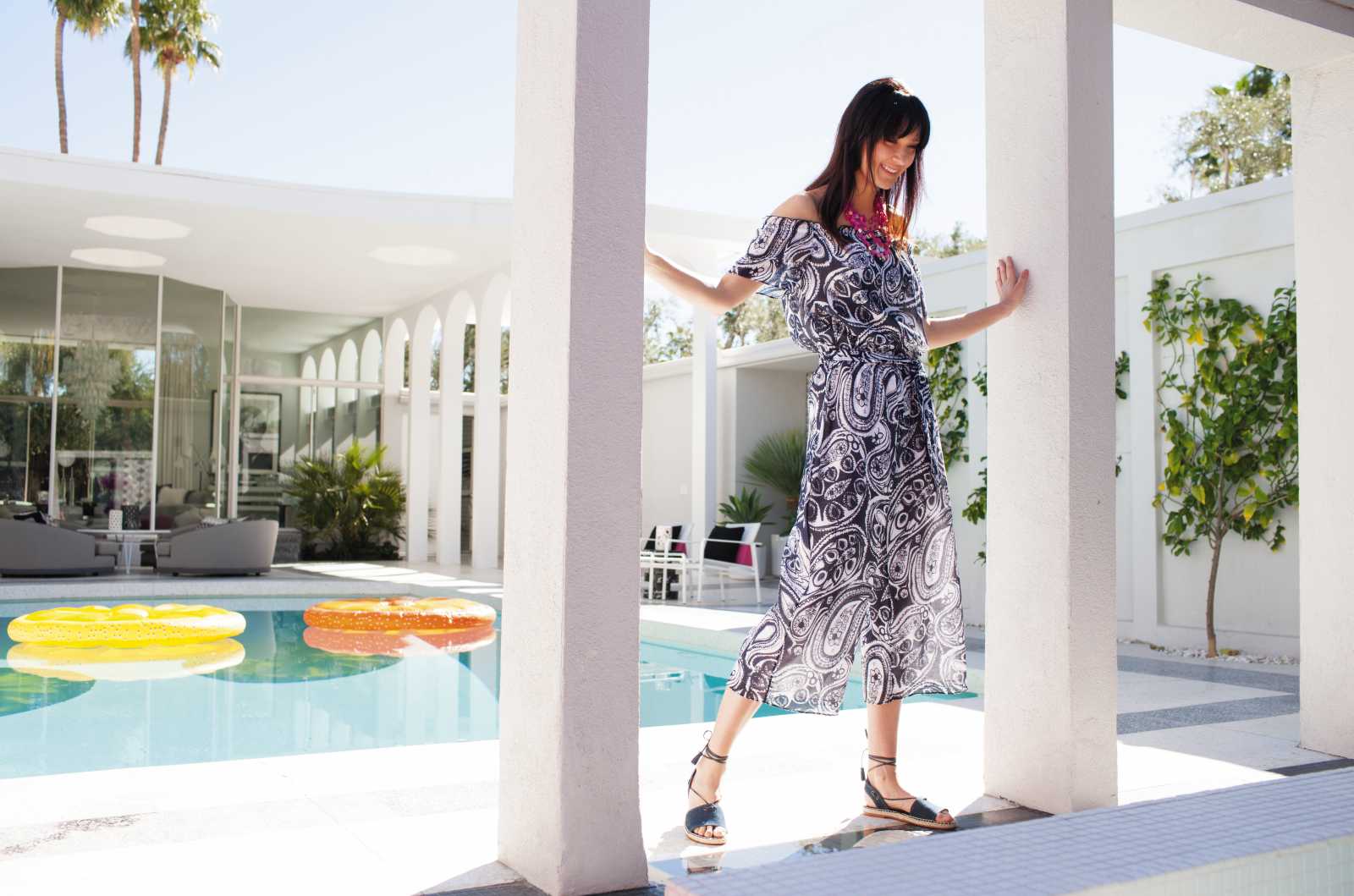 Her advertising campaigns and lookbooks are staged within architecturally significant residences across Southern California, transforming iconic works into active collaborators. Staging photo shoots at Frey House II by Albert Frey or runways at sites like Marrakesh Country Club in Palm Desert, color, line, and silhouette enter into direct exchange with structure, light, and landscape.